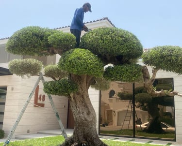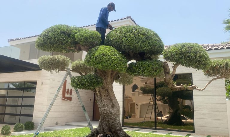 This project highlights our expert tree shaping and landscaping work in Dubai’s premium residential area. Our skilled team carefully trimmed and sculpted the tree into a perfect multi-layered shape that complements the modern villa design. Each cut was made with precision to maintain the tree’s health while creating a beautiful, balanced look.