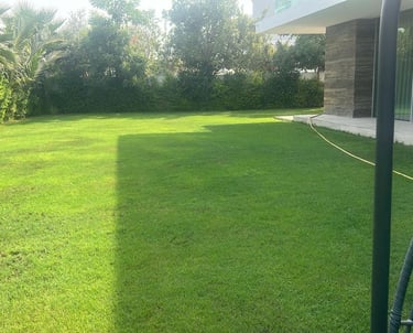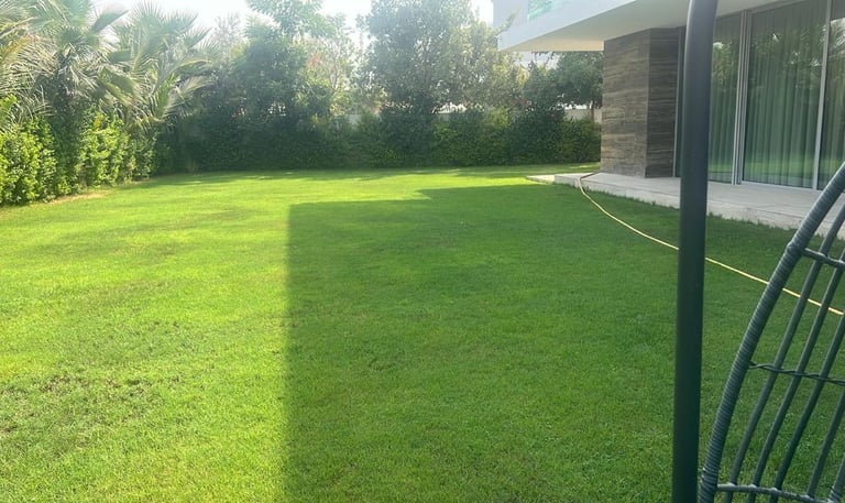 This lush green lawn showcases a perfectly leveled and well-maintained grass area, ideal for villa gardens and outdoor spaces in Dubai. Our team prepared the ground with professional soil treatment and installed a high-quality irrigation system to ensure even watering and long-lasting freshness. The result is a soft, vibrant green surface that enhances the beauty of the entire property.