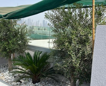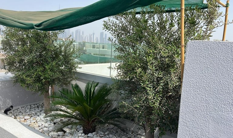 This modern rooftop garden features elegant olive trees and a tropical sago palm, creating a perfect mix of greenery and style. The white decorative stones add a clean, luxurious touch while keeping the area cool. Each plant was chosen to suit Dubai’s climate, offering a calm and refreshing natural space that enhances the beauty of any modern villa or terrace.